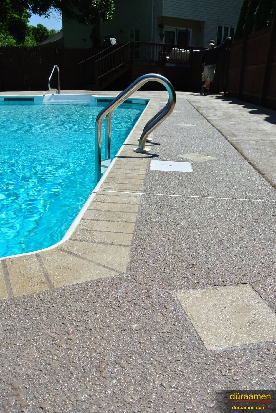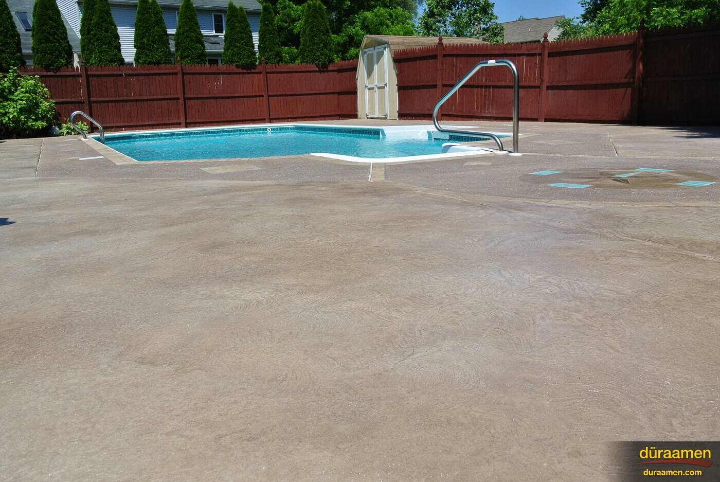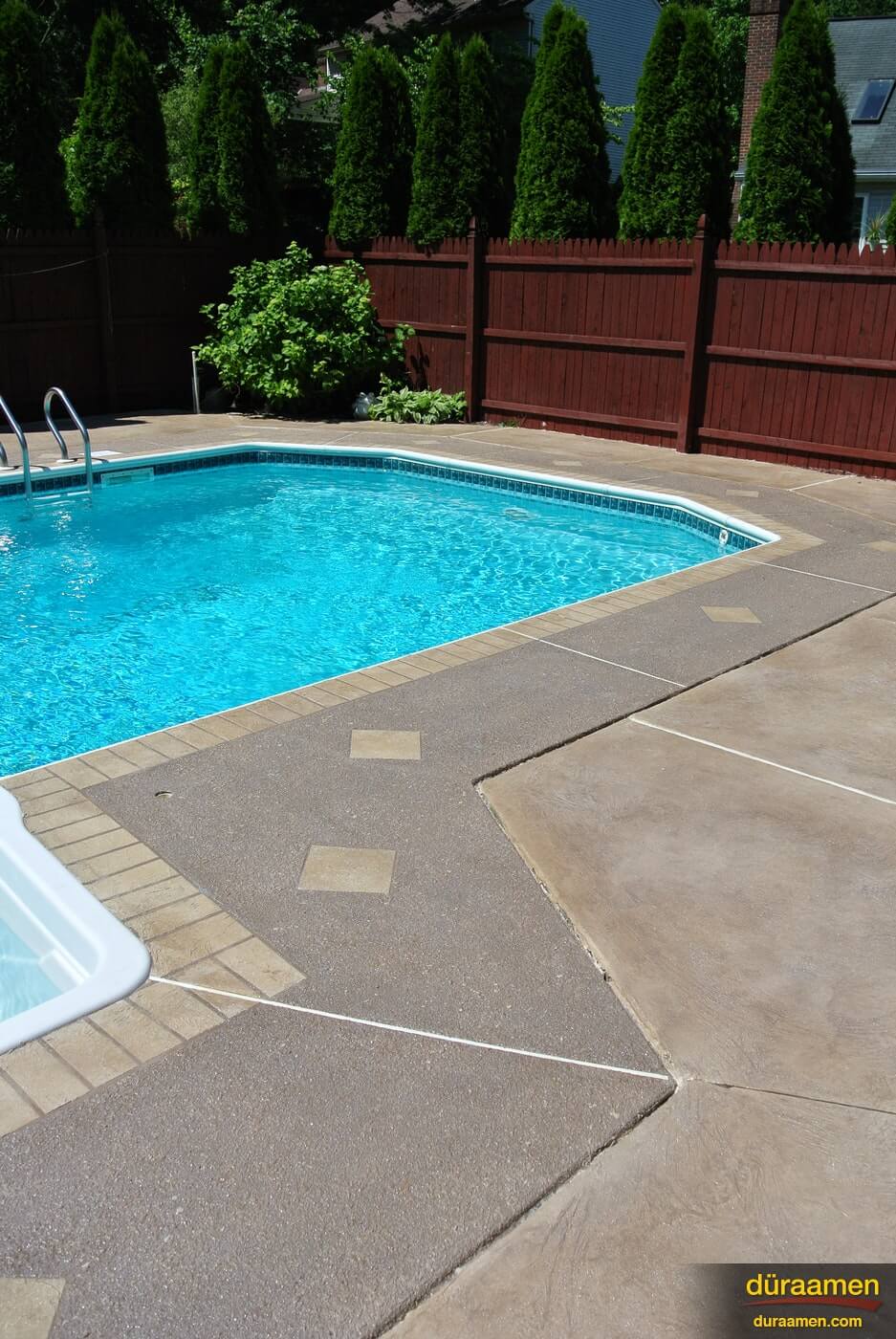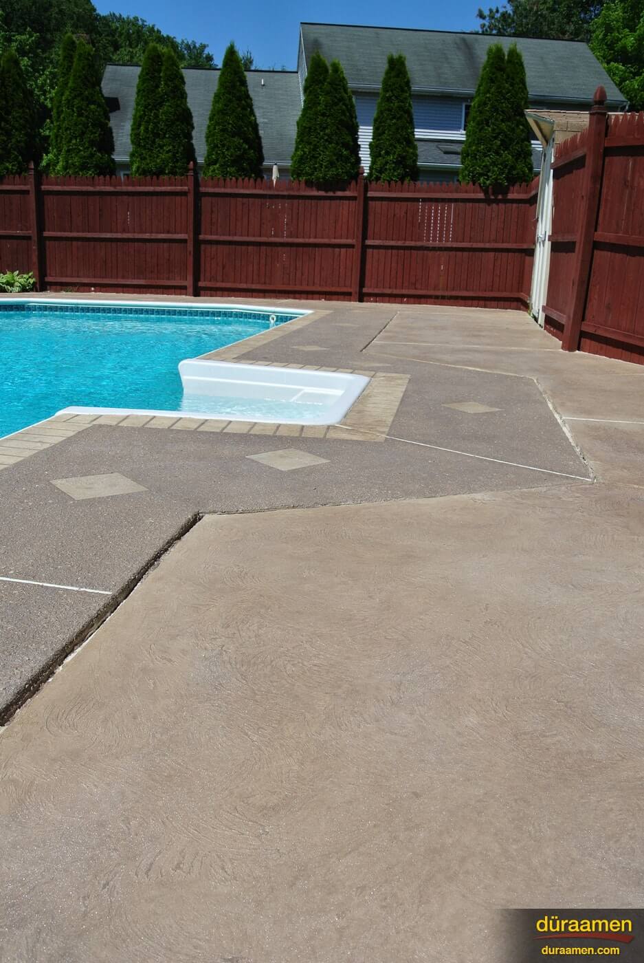 Pool decks can be renewed using Uberdek, exterior concrete resurfacing products that can be integrally colored with Colorfast and sealed with Dekguard. Uberdek by Duraamen is a single component polymer modified concrete formulated to resurface existing outdoor concrete surfaces. Resurfacing exterior concrete is a very cost effective solution compared to concrete replacment.