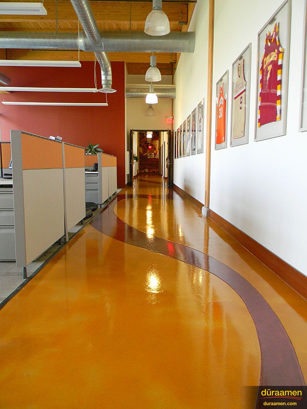 The possibilities with metallic epoxy flooring are endless. Here, the Cavaliers Team Shop sports a floor design pattern