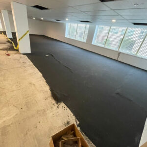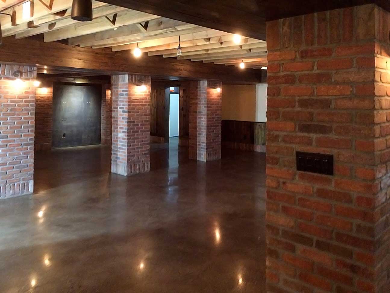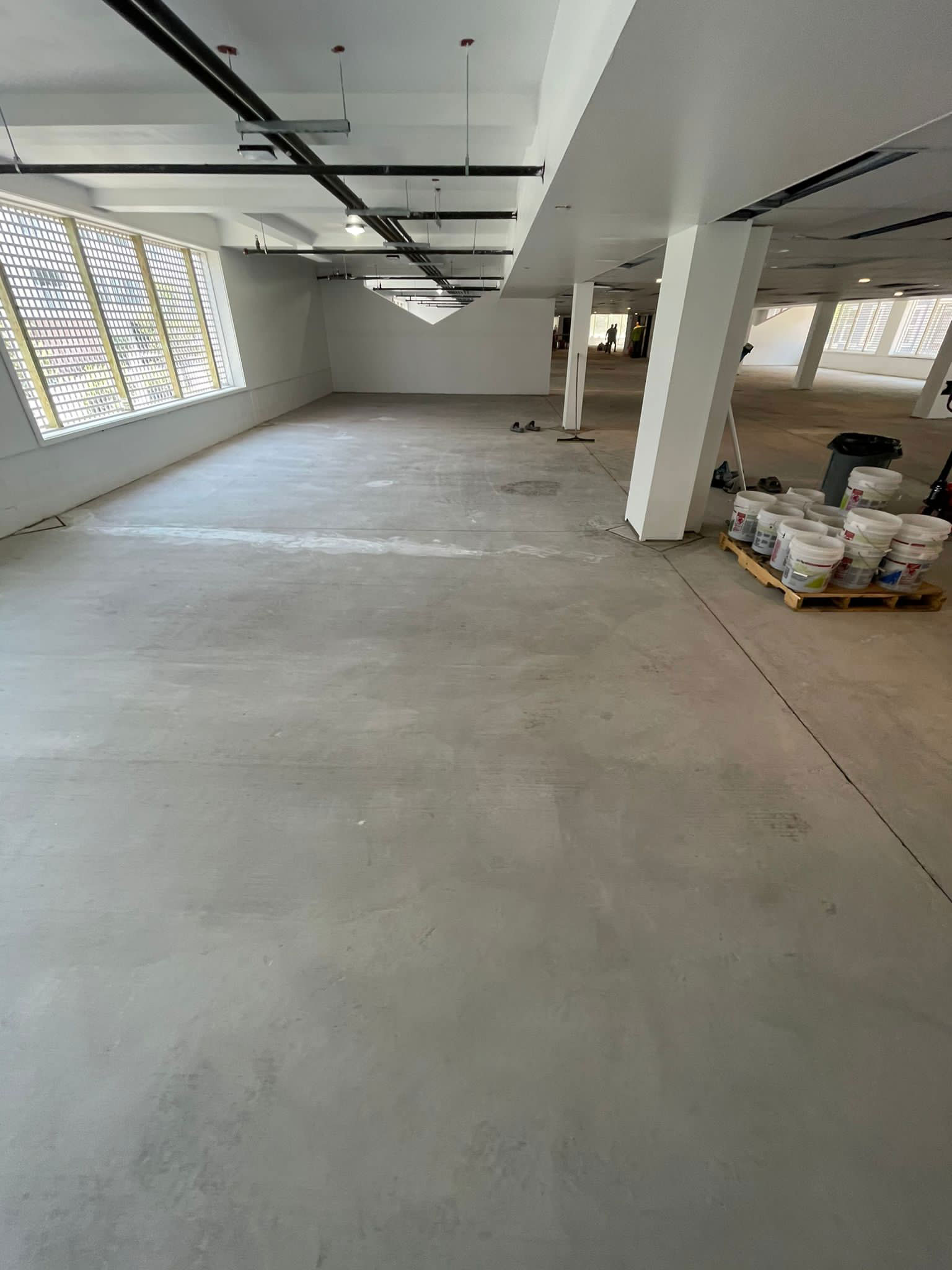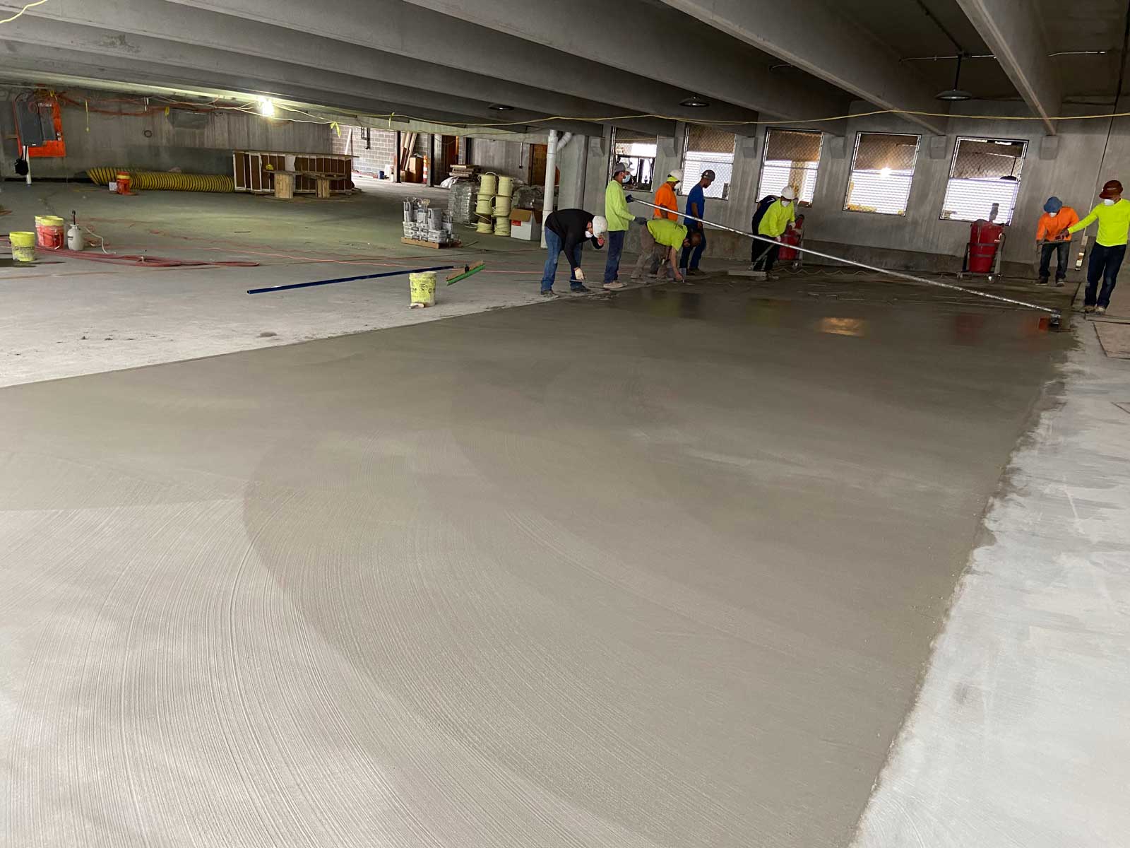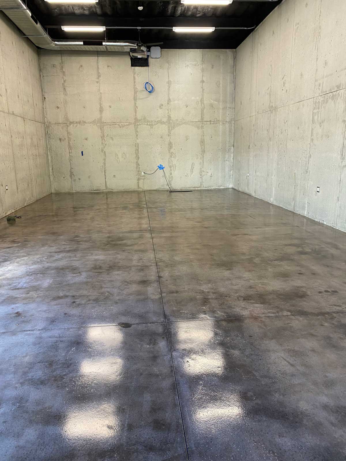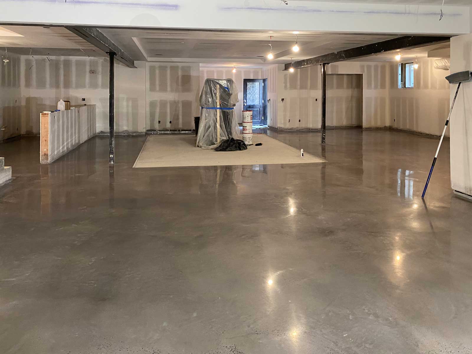 Our self-leveling cement-based overlay floor systems can be applied from 1/4” to 5” thick. They can be colored through various means, and many topcoat and sheen options exist.